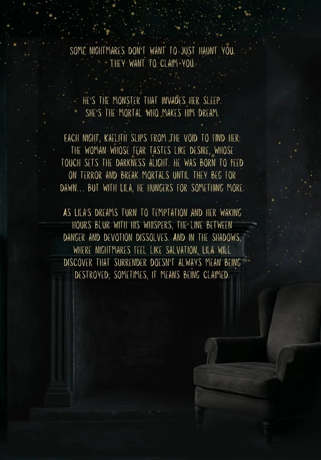 As Lila's dreams turn to temptation and her waking hours blur with his whispers, the line between danger and devotion dissolves. And in the shadows, where nightmares feel like salvation, Lila will discover that surrender doesn’t always mean being destroyed; sometimes, it means being claimed.